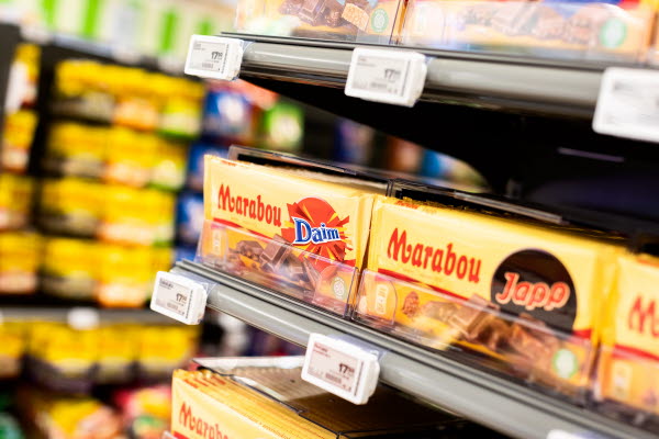 A shelf-ready display with sliding tiles that help prevent sweeping while keeping products visible and easy to access.